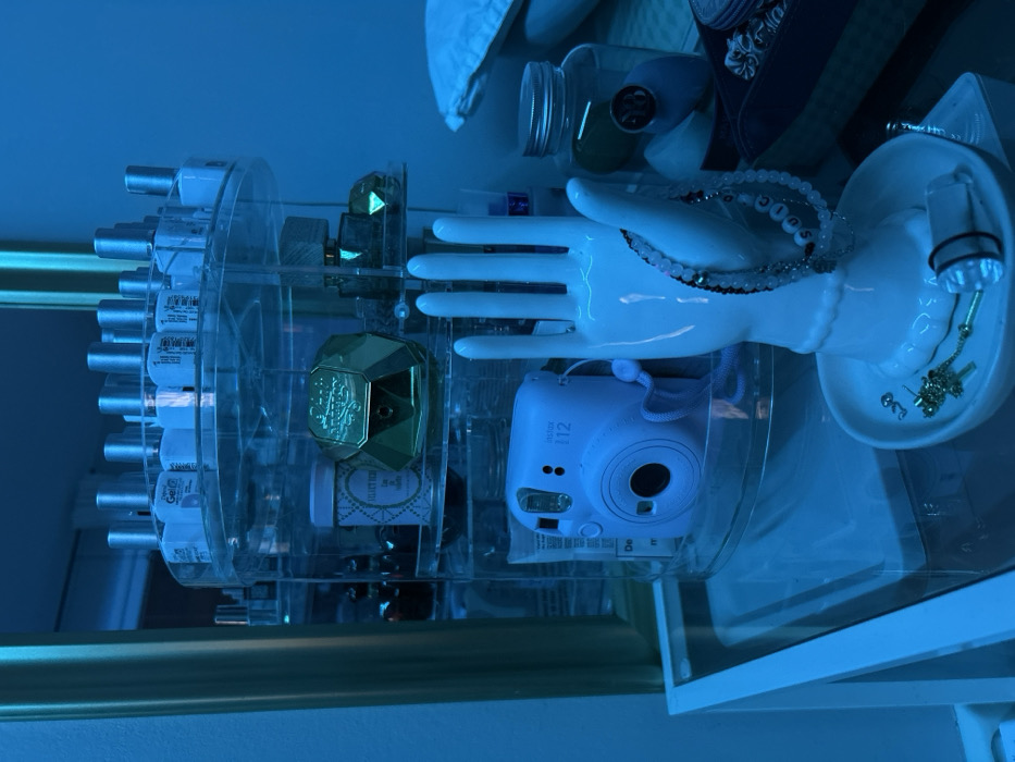 The image displays an indoor still life scene under strong blue artificial lighting, rendering most colors in a monochromatic blue hue. A white ceramic hand-shaped jewelry holder occupies the foreground, draped with multiple bracelets, one visibly spelling "SOOS" in white letters. The base of this holder forms a small dish containing a gold-colored key charm, a small ring, and a cylindrical metallic object. To the left, a clear, multi-tiered acrylic rotating organizer holds various cosmetic and personal care items. The top tier contains numerous nail polish bottles. The middle tier features a gold-colored polygonal perfume bottle, identifiable as "Lady Million," alongside a white cylindrical container marked "Velvet Rose." A light blue Fujifilm Instax Mini 11 instant camera is positioned on a lower tier. To the right of the hand holder, a clear glass jar containing makeup sponges and a dark, possibly velvet, jewelry box are partially visible. These items rest on a white-framed surface with a clear top. A gold-framed object, likely a mirror or picture frame, is partially visible on the far left. The specific location within Uppsala, Sweden, cannot be determined from the visual evidence presented in the image. No individuals are present.