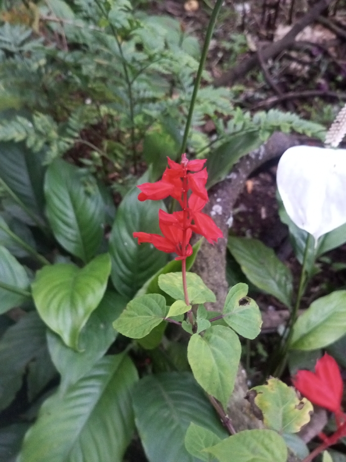The image displays a close-up, ground-level view of a dense botanical scene in Ciherang, Indonesia. The central subject is a cluster of vibrant red, tubular flowers on a slender green stalk, consistent with Salvia splendens (Scarlet Sage). These flowers are oriented vertically, with several individual blooms forming an inflorescence. To the immediate left of the red flowers are large, dark green, ovate leaves, likely belonging to a Peace Lily (Spathiphyllum). To the right and slightly behind the red flowers, a distinct white spathe with a pale yellow spadix, characteristic of a Peace Lily bloom, is visible. A weathered tree branch, greyish-brown with textured bark, runs diagonally from the upper right towards the lower middle, positioned behind the main red flower cluster. The background consists of rich green foliage, varying in leaf shape and size, indicating a lush, natural environment with diverse plant life. In the bottom right corner, a portion of another red flower, similar to the central cluster, is partially visible among green leaves. The ground appears to be covered in soil and organic matter, with diffused natural light illuminating the scene. No individuals or man-made objects are present.