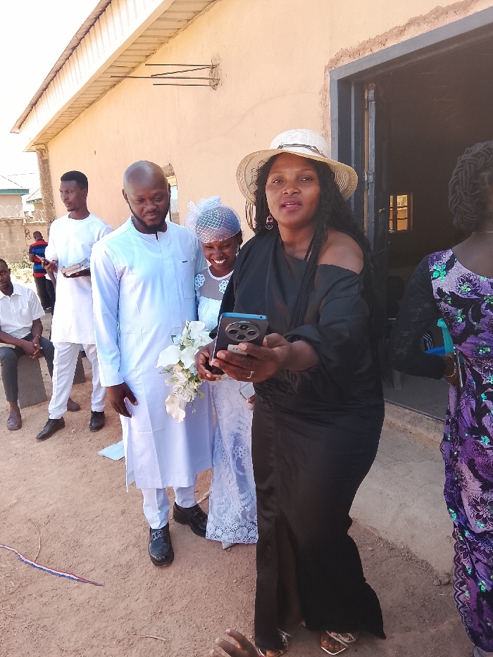 An outdoor scene in Gwafan, Nigeria, depicts several individuals standing on an unpaved dirt ground in front of a light brown building with a corrugated metal roof. In the foreground, a woman with dark braided hair, wearing a straw hat, a black off-the-shoulder long-sleeved top, and a black skirt, holds a dark smartphone with a multi-lens camera array in her right hand, positioned as if recording or photographing. She wears a ring on her left ring finger. Adjacent to her, a man with a bald head, dressed in a light blue traditional Nigerian garment, stands next to a woman wearing a white lace dress and a white veil, holding a white floral bouquet. Both individuals are looking downwards and smiling. To the left, a man in a white traditional Nigerian outfit holds a small rectangular object in his hands. Further left, partially visible, a man in a white shirt and dark pants is seated on a low concrete block. On the far right, a woman in a purple sequined patterned dress is partially visible, standing near a dark rectangular doorway. Three horizontal metal rods protrude from the building's wall above the central figures. A red, white, and blue striped ribbon lies on the ground in the lower-left corner. The lighting indicates clear daylight conditions.