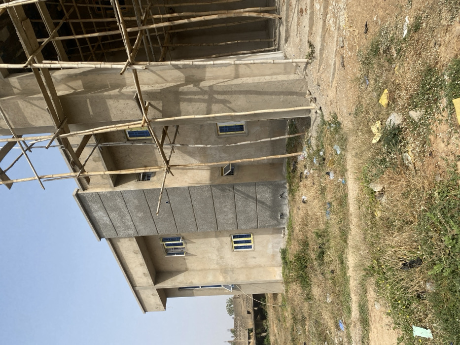 A multi-story concrete structure, approximately three levels high, is under construction in Yan Dala, Nigeria