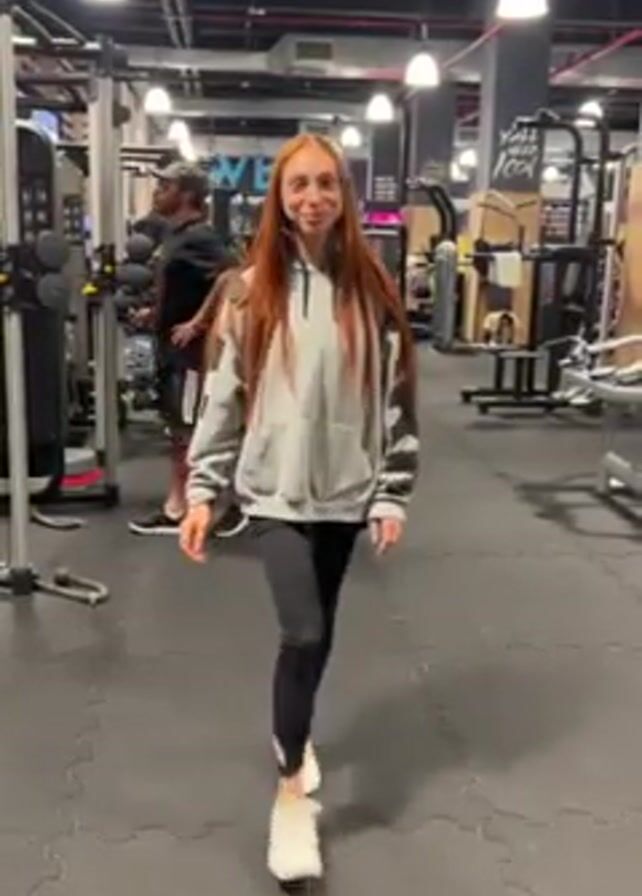 young woman with long red hair walking toward the camera in a gym. She is wearing a gray hoodie, black leggings, and white sneakers. She smiles at the camera and does a quick twirl, looking happy. The gym is populated with various workout machines and other people exercising in the background. The lighting is bright with many overhead lights. The floor is black rubber matting. There is a sign on a pillar in the background.