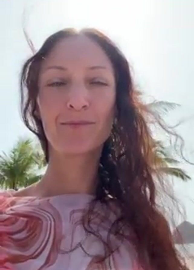 A woman is facing the camera, her face is visible and her expression is pleasant. She has long, wavy, reddish-brown hair that is blowing in the wind. She is wearing a light pink and white patterned top. Behind her is a beach with palm trees and a body of water with large rock formations in the distance. The sky is bright and clear.