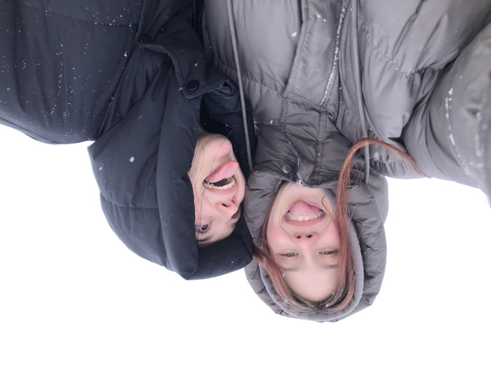 A close-up, upward-angle selfie depicts two young individuals, likely females in their late teens to early twenties, engaged in playful interaction outdoors in the city of Фоки, Russia. The individual on the left wears a grey or khaki-colored puffy winter jacket with the hood up, displaying reddish-brown hair strands. She is smiling broadly, her tongue extended forward towards the camera. The individual on the right wears a black puffy winter jacket with the hood up, also smiling with her tongue extended upward, appearing to catch falling snowflakes. Numerous small, white specks, consistent with active snowfall, are visible on their jackets, hair, and in the air. The background is a uniform white, indicating a heavily overcast sky or an expansive, snow-covered landscape devoid of distinct features. The subjects' expressions and actions suggest a lighthearted moment in a cold, snowy environment.