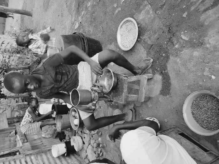 Several people engage in a labor-intensive process outdoors. One person operates a machine, possibly for grinding or processing beans, seated on a low stool. A collection of buckets and containers surrounds them, along with trays filled with what appear to be beans or grains. Other individuals are also involved in the activity, with one washing dishes in a bucket. The scene evokes a sense of manual labor and community activity.