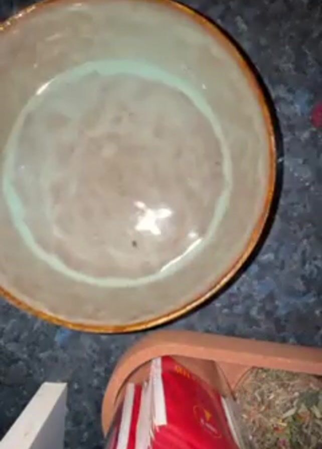 person placing a round, shallow bowl on a dark countertop