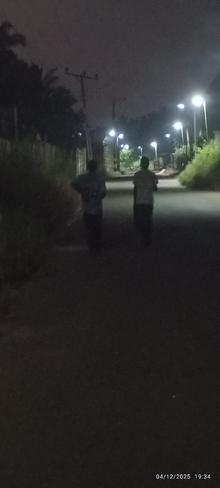 Two figures walk away on an asphalt road at night. Streetlights illuminate the road ahead, with vegetation lining each side. To the left, a fence is visible. A utility pole stands tall, with lines stretching across the sky. The sky is overcast. The timestamp "04/12/2025 19:34" is displayed in the lower right corner.
