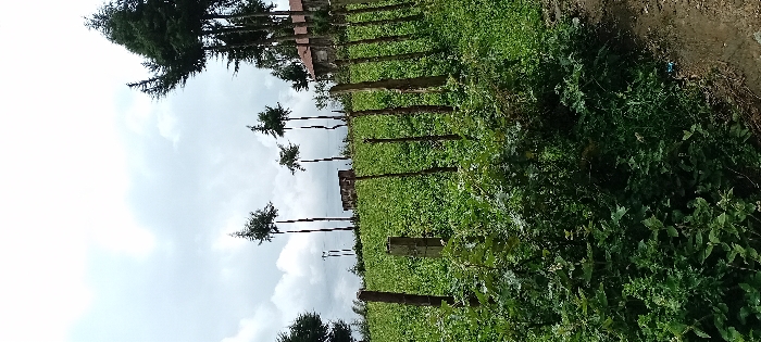 This image, taken in Rwanyambo, Kenya, presents a rural agricultural landscape under an overcast sky. A dirt path lines the immediate right foreground, adjacent to dense, unruly green vegetation that extends across the lower left. A varied fence line, composed of irregularly spaced wooden and one concrete post, traverses the mid-ground, demarcating the foreground foliage from an expansive field of uniformly short, green crops. In the background, several tall, slender conifer-like trees with prominent top canopies are scattered across the horizon. To the far right, behind the fence and trees, a building with a reddish-brown corrugated metal roof and light-colored walls is partially visible. Further left in the distance, a smaller, darker structure is present. Two utility poles with visible wires stand against the sky on the far left of the background. No individuals or specific actions are discernible within the scene.