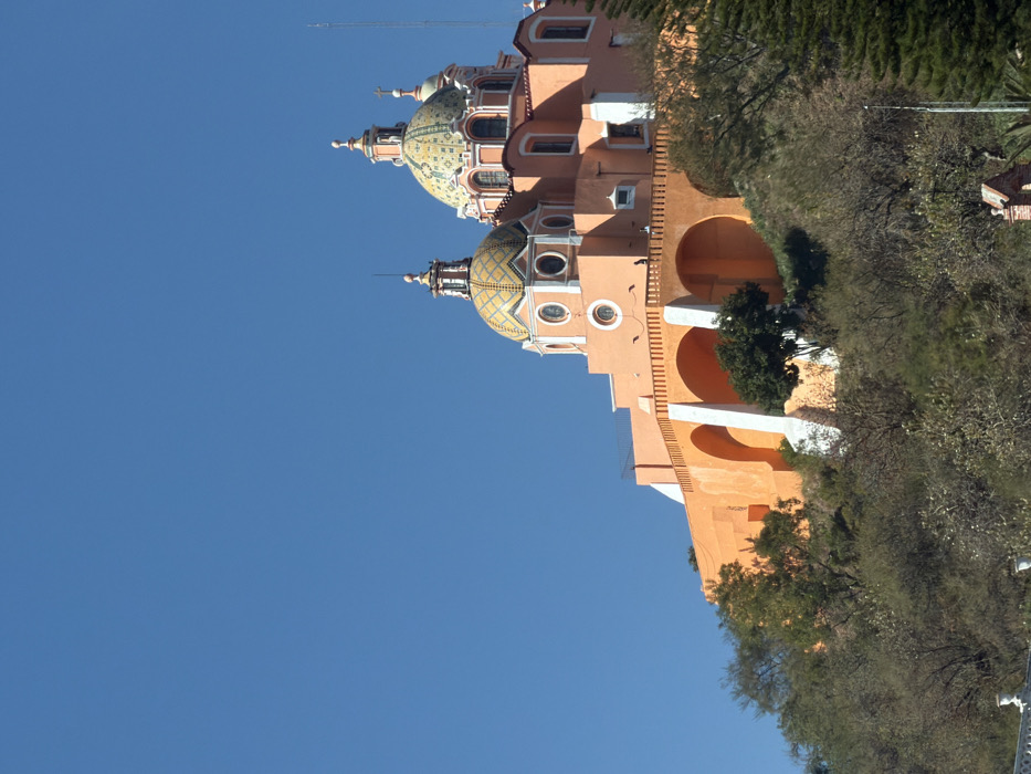 An upside-down view shows an orange building with two tiled domes, set against a clear blue sky and foliage. The building features arched openings and windows. The domes display intricate patterns and vibrant colors. Trees and shrubs are visible on the right, partially obscuring the building's structure. The photograph captures the architectural details of the building and the surrounding landscape.