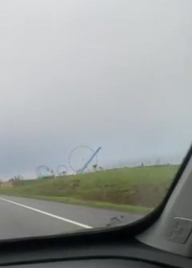 roadside view from inside a moving vehicle. On the right side of the road, a green field features a Ferris wheel and a roller coaster. The sky is overcast, giving the scene a muted, grey tone. The road is paved and marked with white lines. The camera angle suggests the view is from the driver's seat. Other vehicles can be seen traveling on the road.