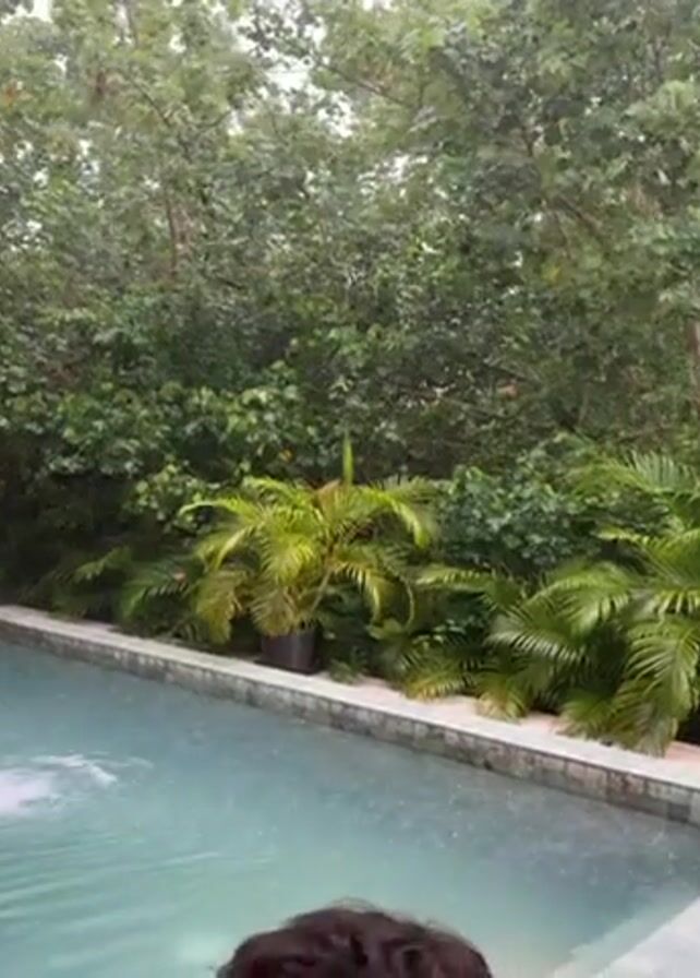 swimming pool surrounded by lush green trees and plants. The pool has a light blue color and a tiled edge. It's raining, and droplets can be seen falling on the water surface. The camera angle is slightly angled up and looks towards the pool and the surrounding greenery. A person is visible in the foreground, partially obscured, with dark hair. In the background, some indistinct sounds of music and people talking can be heard. The atmosphere appears to be tropical and humid.