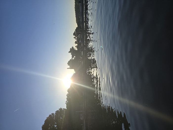 The image showcases a bright, sunny day near a body of water. Sunlight glares from the water surface, reflecting off the rippling waves. Trees and possibly buildings line the distant shore, silhouetted against the bright sky. The sun is prominently positioned, creating lens flare and adding to the overall brilliance of the scene. The sky is a clear, vibrant blue.