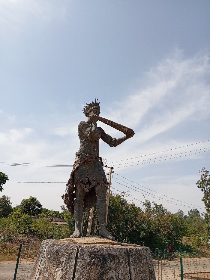 A weathered concrete or stone statue, depicting a stylized human figure, stands prominently in an outdoor setting in Jos, Nigeria