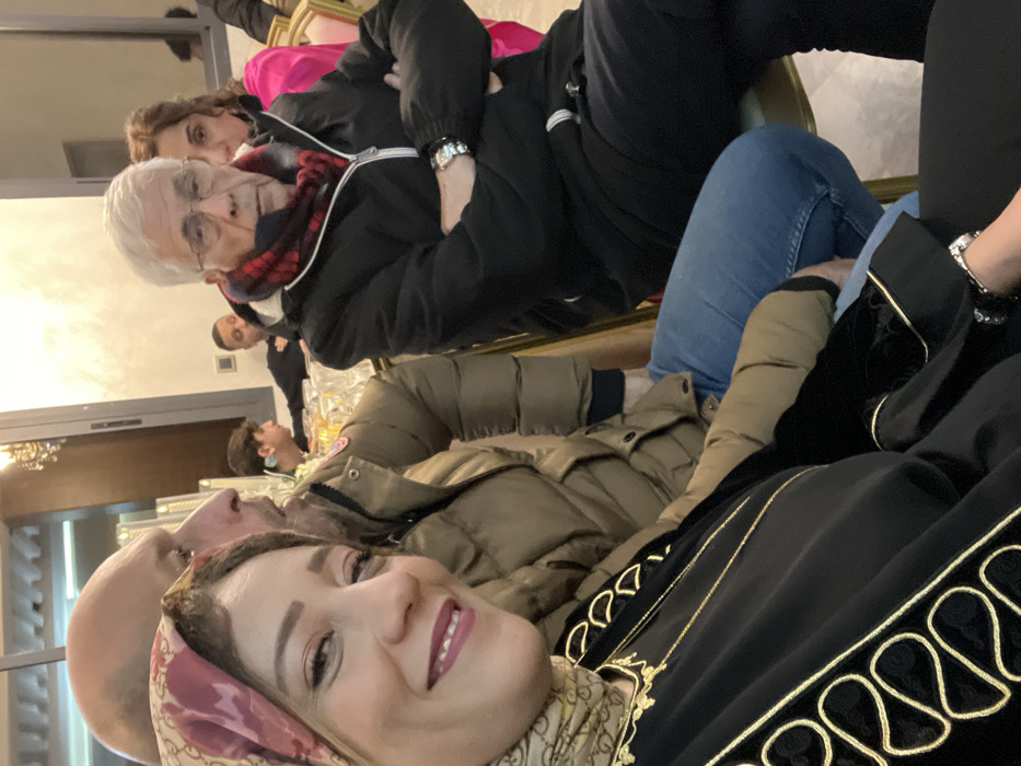 A group of people sit close together. A woman in a headscarf smiles at the camera, while a bald man beside her looks up. Behind them, a man with white hair and glasses looks to the side, wearing a patterned scarf. A woman in a bright pink top is also visible. Other people are seated further back, and the scene appears to be indoors with chandeliers visible in the background.