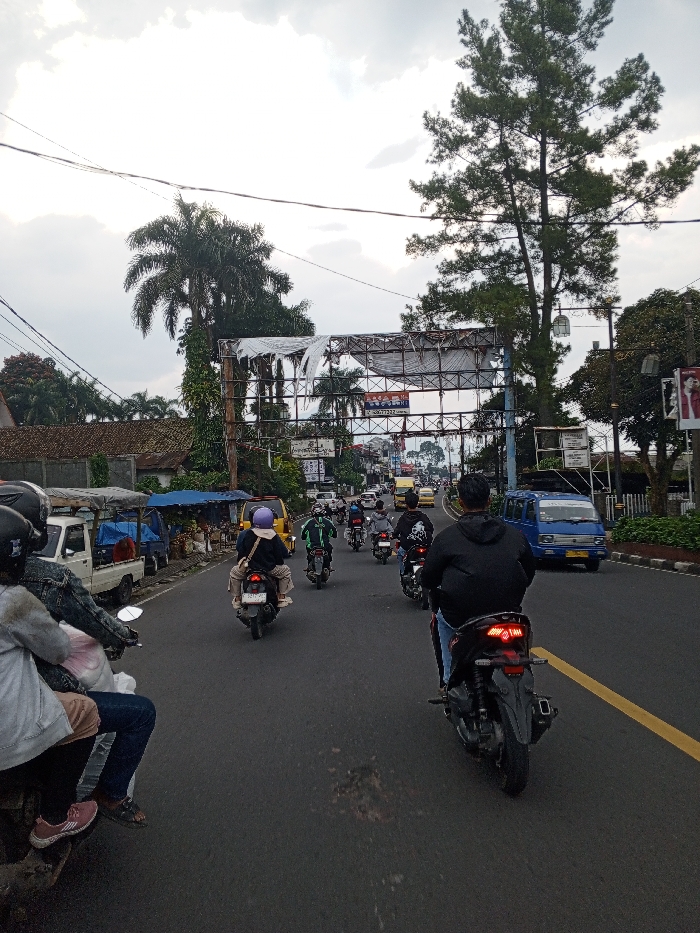 The image depicts a moderately busy street scene in Kheda, India, viewed from the perspective of a vehicle occupant. The sky is overcast. In the immediate foreground on the left, the lower body of a person wearing a light top, dark blue jeans, and pink athletic shoes is visible, seated on the rear of a dark-colored motorcycle. To their left, a white pickup truck with a blue tarp covering its bed is parked roadside. The main focus is a two-lane asphalt road leading into the distance, with a yellow dividing line. Multiple motorcycles, at least seven, are traveling away from the viewer. Riders are generally wearing helmets and dark clothing. The closest central motorcycle rider wears a black hoodie and blue jeans, on a dark vehicle with a visible red taillight. Further down the road, a yellow minivan and a blue box-style van are also visible. On the left side of the road, a low-rise building with a brown corrugated roof is present, alongside a blue-tarped market stall structure. Palm trees and other dense foliage are visible above these structures. On the right side of the road, a tall, pine-like tree stands prominently. An overhead metal billboard structure with torn, white material spanning the road is a dominant feature in the mid-background. Buildings with various signs and posters line both sides of the street further into the distance. Utility poles and overhead wires are present. The road appears to ascend slightly, with more vehicles visible in the far background under a bridge-like structure.