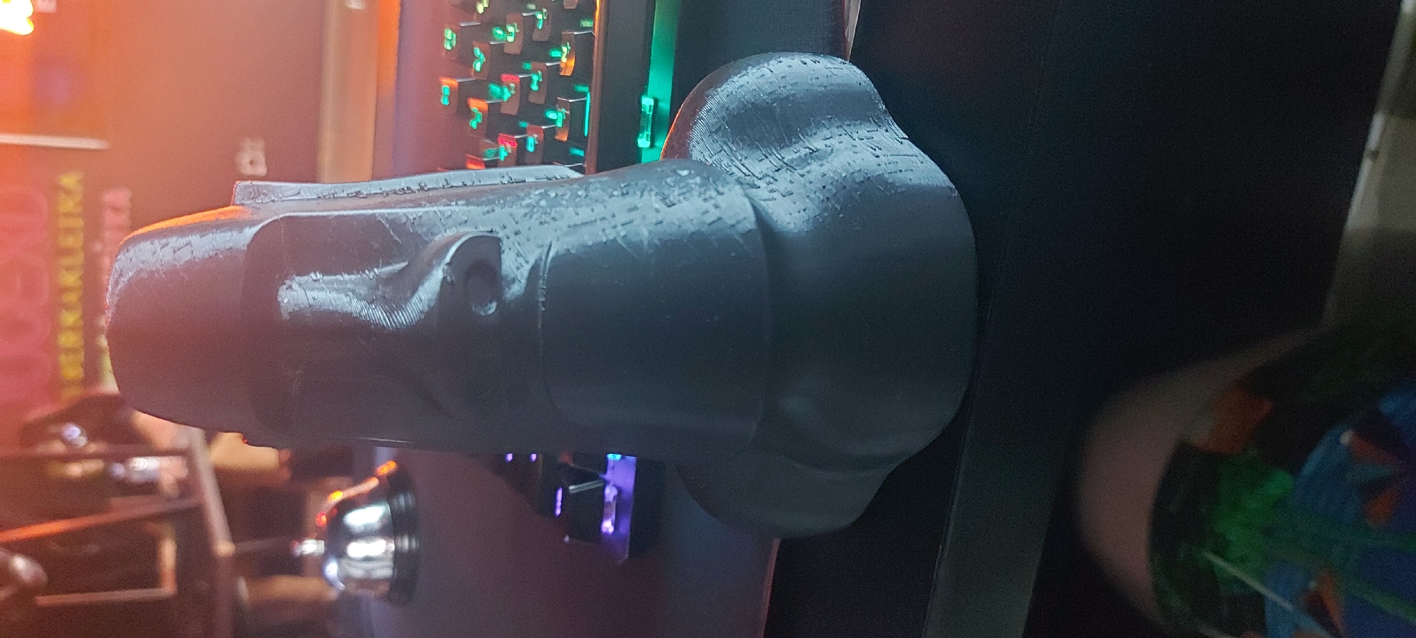 A gray, 3D-printed head sculpture rests on a surface next to a partially visible mechanical keyboard with colorful LED backlighting