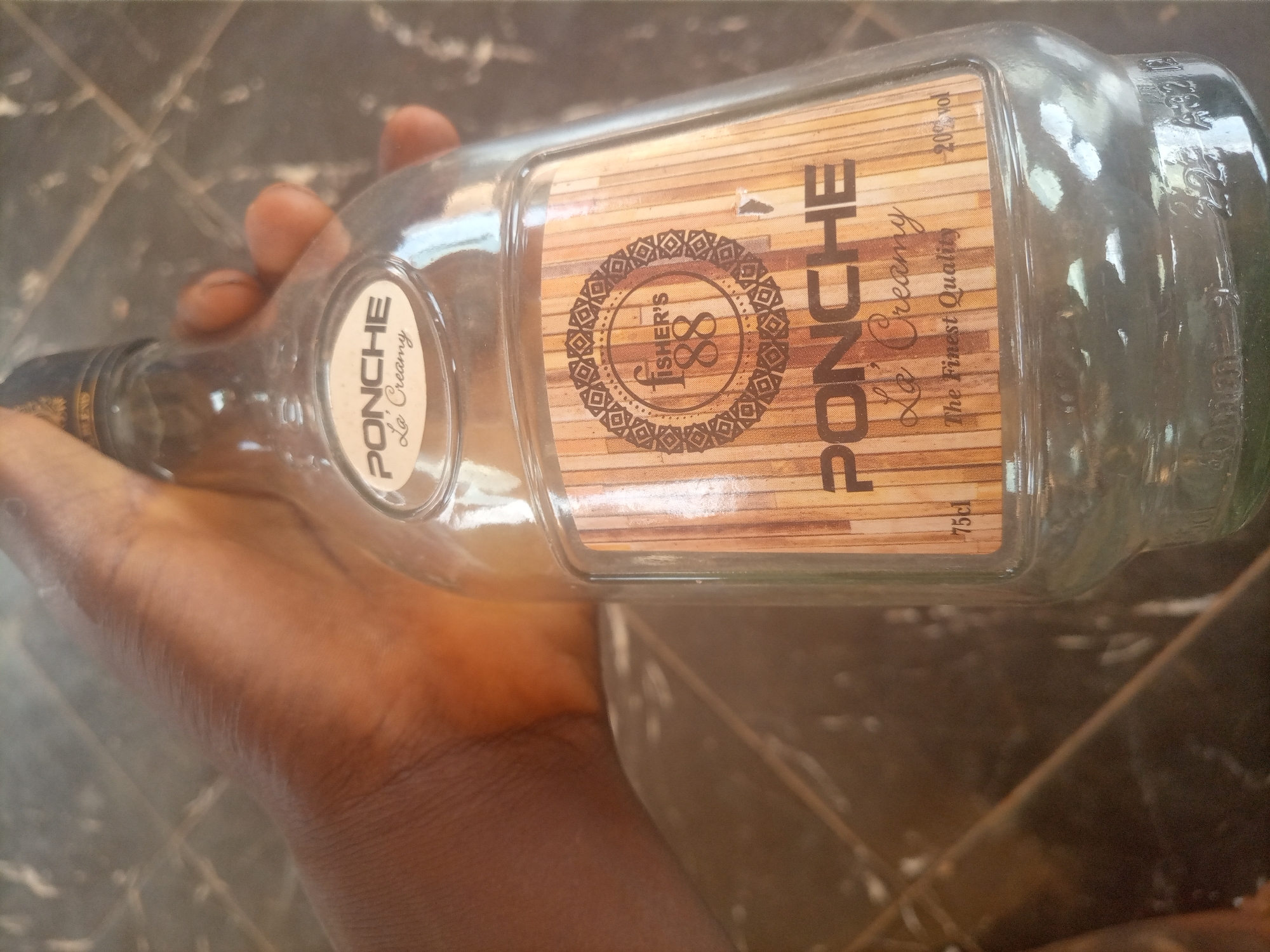 A dark-skinned human hand firmly grasps a clear glass bottle, presented horizontally. The bottle bears a primary label identifying the contents as "PONCHE La Creamy, The Finest Quality," with a "FISHER'S 88" emblem and text "20% vol," "75cl" on a simulated wood-grain background. A smaller neck label reiterates "PONCHE La Creamy." The bottle appears mostly empty, containing minimal liquid residue. The background is blurred and dark, exhibiting indistinct patterns and reflections; it provides no specific visual cues to identify a location in Alor, Nigeria.