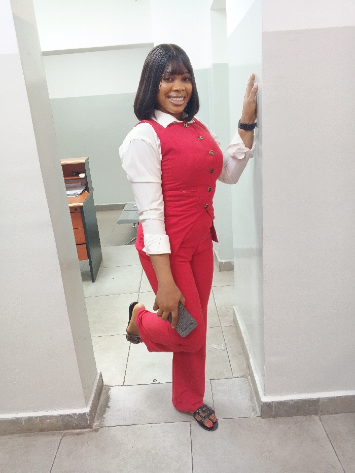 A single adult female stands posing in an indoor commercial or office building hallway in an unknown city and country. She has shoulder-length dark hair with bangs and is smiling. She wears a white collared long-sleeve shirt, a red vest with gold buttons, and matching red trousers. A black smartwatch is on her left wrist. She wears black slip-on sandals with red nail polish visible on her toes. Her right hand is pressed against a white wall. Her left leg is bent at the knee, with the foot raised, and she holds a grey textured smartphone in her left hand, resting it on her raised thigh. The floor is covered with light grey square tiles, featuring darker grey baseboards. In the background, a wooden desk with papers and a light grey bench are visible.