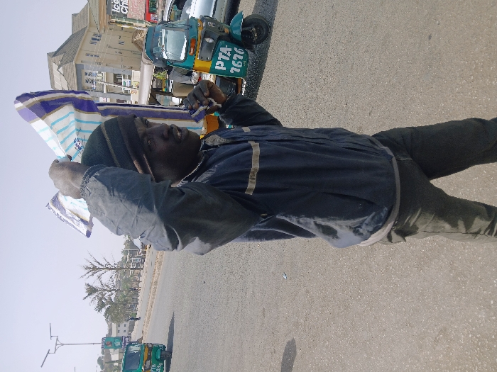 The image depicts a male individual walking on a paved street in Mumbwa, Zambia, under clear daylight conditions