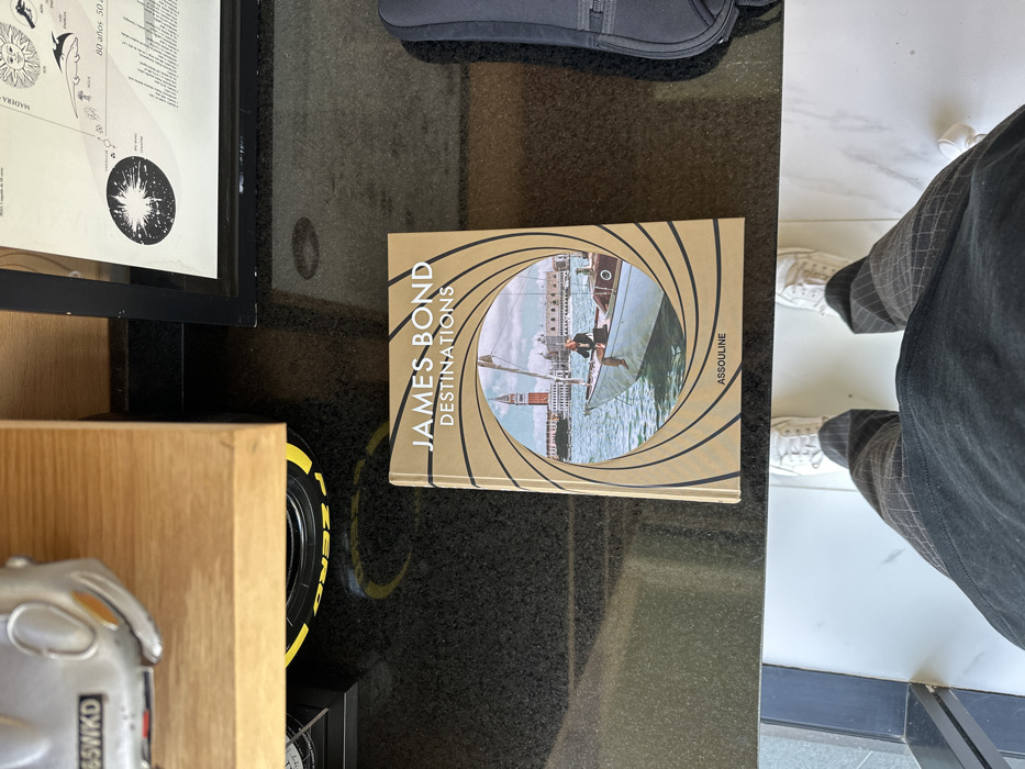 A "James Bond Destinations" book sits on a black speckled surface, next to a gray soft case and the edge of a framed picture