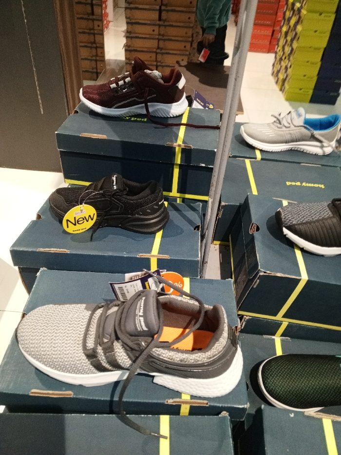 The image displays an indoor retail environment, specifically a shoe store or a dedicated footwear section, located in Sandhikharka, Nepal. The foreground and midground are dominated by various athletic and casual shoes presented on stacked dark blue shoe boxes, which feature distinct yellow stripe patterns and brand names like "homy pod." Prominently featured shoes include: * A maroon athletic shoe with a white sole and dark laces, positioned atop a box in the upper left. A tag is visible near its laces. * A black child's shoe with a yellow circular "New" tag, displayed on a box in the middle left. * A grey knitted athletic shoe with dark grey laces, a white sole, and an orange interior lining, placed on a box in the lower left, showing a partial price tag. * A light grey athletic shoe with a blue interior lining and a white sole, situated on a box in the upper right. * Partially visible footwear includes a black and grey knitted shoe in the mid-right and a dark green mesh shoe in the lower right. In the blurred background, a person wearing a green long-sleeved top and dark trousers is partially visible, holding a red item, possibly a price tag or product detail. The background also reveals numerous stacks of additional shoe boxes, indicating retail inventory. A vertical metallic or light-colored pole traverses the mid-ground, serving as a structural or display element. The scene is illuminated by artificial indoor lighting.