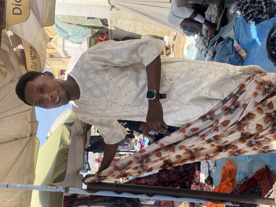 - "An outdoor market scene in Sabon Gari South, Nigeria, shows a young adult male standing and presenting fabric" by FM-nrUyz2, licensed under CC BY 4.0