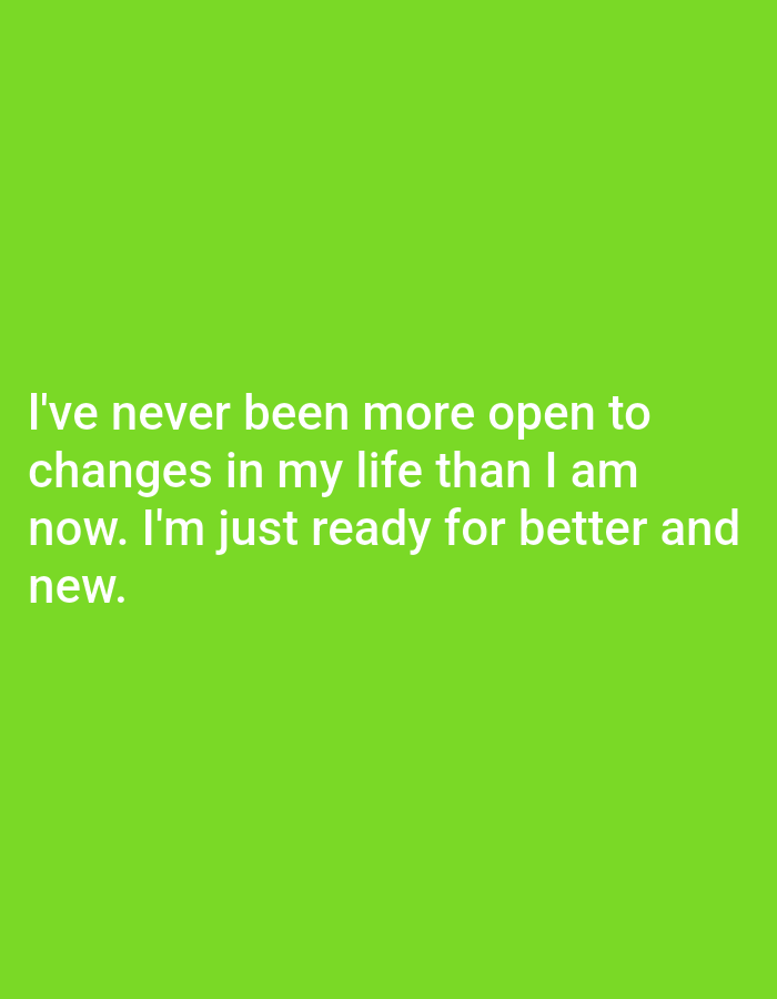The image, originating from Otu, Nigeria, displays white text on a solid, vibrant green background. The text, serving as the central subject, reads: 'I've never been more open to changes in my life than I am now. I'm just ready for better and new.' The environment consists solely of the uniform green color field.
