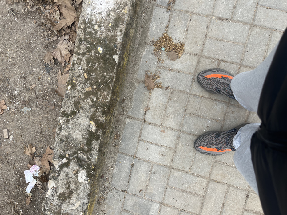 The image displays a high-angle, downward perspective of an individual's lower body and the immediate ground environment within an outdoor urban setting
