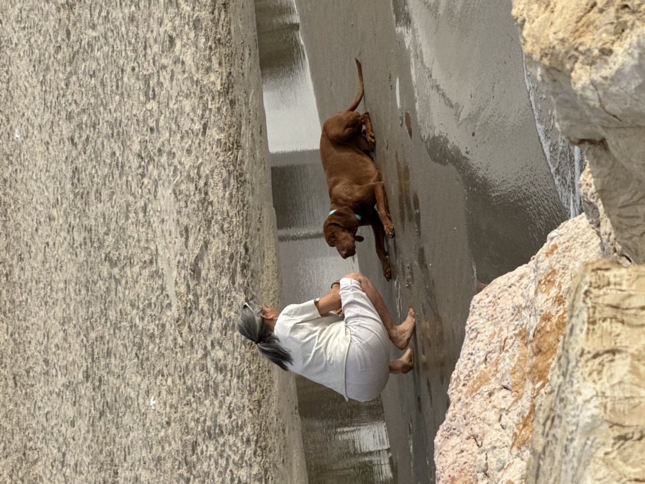 This image captures an adult female and a dog on a beach in Tel-Aviv, Israel. The female, possessing gray hair in a ponytail and wearing sunglasses perched on her head, is squatting barefoot in shallow water and wet sand. She is dressed in a light-colored short-sleeved t-shirt and light capri pants, with a watch on her left wrist. She faces a reddish-brown dog, likely a Vizsla, wearing a light blue collar, which is lying prone in the shallow water and wet sand with its mouth slightly open. The immediate foreground features light-colored rocks, while the background consists of a broad expanse of dry, textured sand. The scene depicts a quiet interaction between the two subjects on the shoreline.