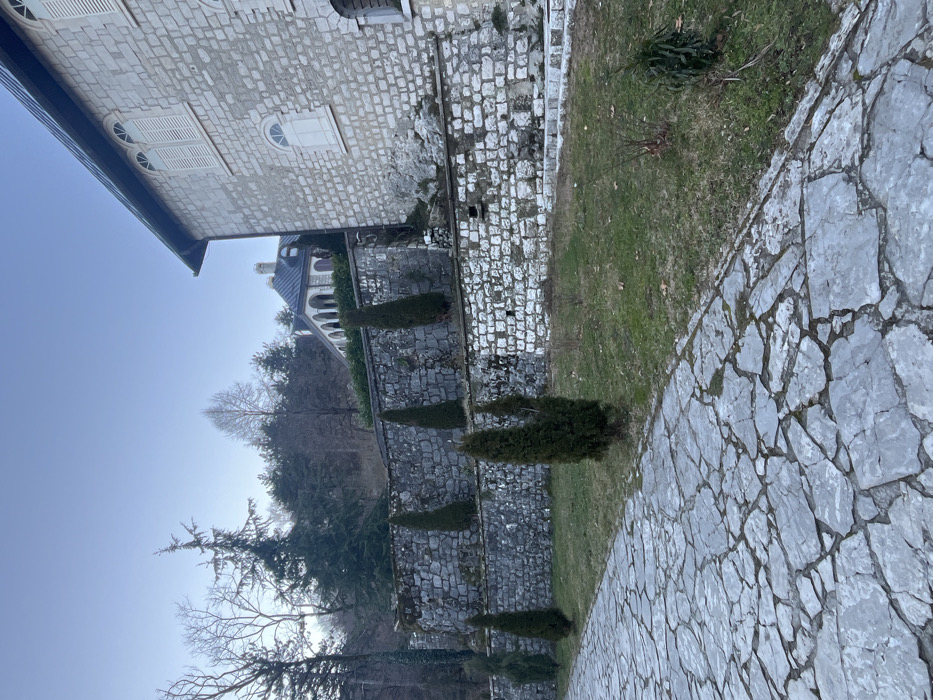 The image displays an outdoor scene in Cetinje, Montenegro, featuring architectural elements and landscaping. In the immediate foreground, a pathway composed of irregularly shaped, flat grey flagstones curves from the lower left to the center. To its right, a strip of sparse green and brown grass extends uphill. The mid-ground is dominated by a series of tiered stone retaining walls, constructed from light grey and tan rough-hewn stones, some exhibiting moss or weathering. These walls ascend the hillside. Several dark green, conical evergreen shrubs are planted at regular intervals along these walls and adjacent to the flagstone path. On the right side of the frame, a large, multi-story building constructed of light-colored, roughly cut stone blocks is prominent. It features multiple arched windows fitted with light-toned louvered shutters. A dark roof edge is visible at the top right. Higher up the slope, in the background, another substantial stone building with a dark roof and a distinctive arcaded lower facade is partially visible, set against a backdrop of dense trees, including both bare deciduous and dark green evergreens. The sky above is clear and light blue. No individuals are present in the scene.
