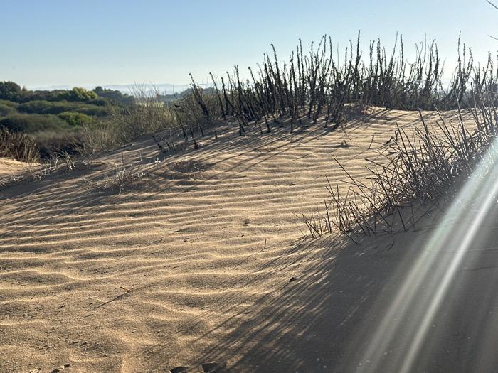 An outdoor scene in Ga'ash, Israel, depicts a sunlit sand dune in a natural environment. The foreground features light tan sand with distinct, parallel ripple patterns created by wind action. Sparse, dry vegetation, consisting of dark, slender stems and grass-like clumps, protrudes from the sand, particularly along the crest of the dune and in the lower right. Low-angle sunlight, likely from the right, casts long, sharp shadows across the sand ripples, highlighting their texture. A strong sun flare is visible in the lower right corner. In the midground, a dense line of green foliage, including trees and shrubs, is visible, contrasting with the sandy foreground. The background consists of a hazy blue sky above a distant, indistinct landform. No individuals, animals, or man-made structures are present within the immediate scene.