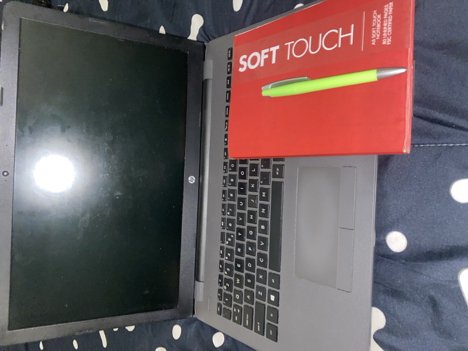 An HP laptop with a closed screen is partially covered by a red notebook labeled "SOFT TOUCH"