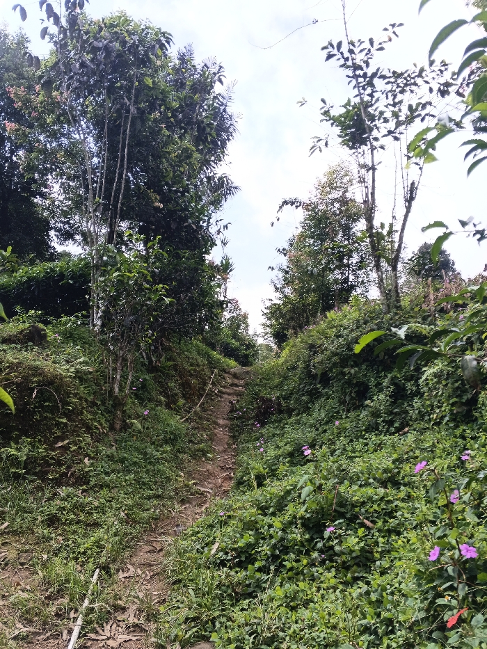 A narrow, uphill dirt path cuts through dense, green vegetation. Lush foliage blankets both sides, dotted with small purple flowers. Tall trees flank the pathway, their branches reaching towards a cloudy sky. The perspective creates a sense of depth, leading the eye up the hill and into the distance. The scene depicts a natural, possibly rural, landscape.