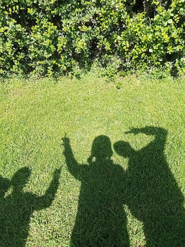 This image, captured in Nyeri, Kenya, depicts an outdoor scene under direct sunlight. The lower two-thirds of the frame are occupied by a neatly cut, verdant green grass lawn. The upper third features a dense, uniformly green leafy hedge. Three distinct human shadows are cast upon the grass, suggesting the presence of three individuals positioned out of frame, behind the light source. The leftmost partial shadow shows an arm raised with fingers extended upwards. The central shadow, identifiable by a head outline suggesting hair past the shoulders, has its right arm extended upwards with an open hand gesture. The rightmost shadow, partially overlapping the central one, also shows a raised right arm forming a specific, distinct hand pose. No other objects or subjects are visible.
