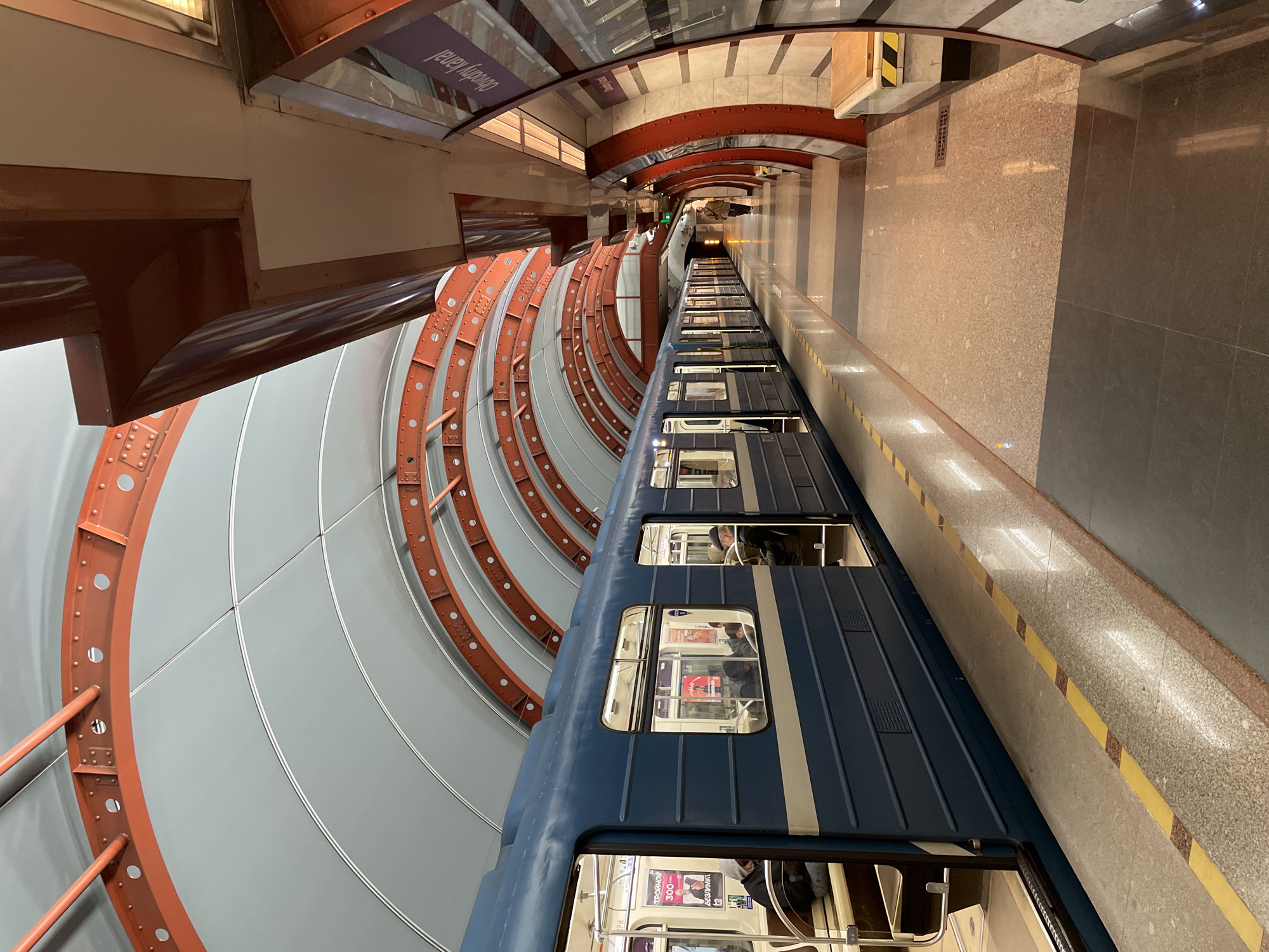 The image depicts a subway station in Saint Petersburg, Russia. A blue subway train is stationary at a platform. Passengers are visible inside the train cars through the windows. The platform is made of granite tiles, with a yellow and brown striped safety line along the edge. The tunnel architecture features gray panels with red-orange circular structural elements. A sign with Cyrillic text is partially visible above the platform. The scene is well-lit.