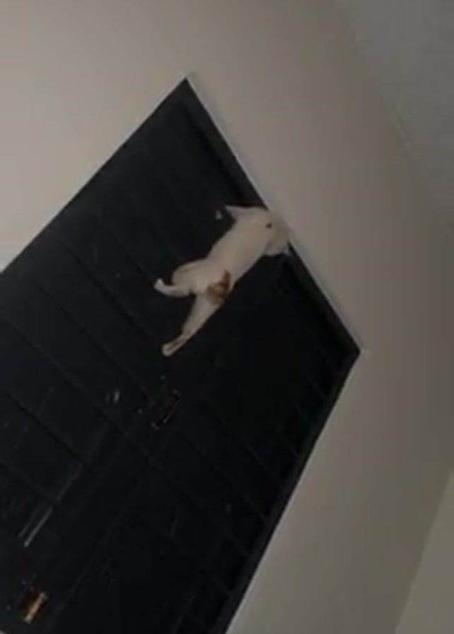 A single, low-angle shot depicts a white cat with some orange markings stuck between the bars of a black metal window security grate. The cat appears to be in a relaxed, almost sleeping position with its belly exposed. The grate is mounted in a white wall. The video is shaky.
