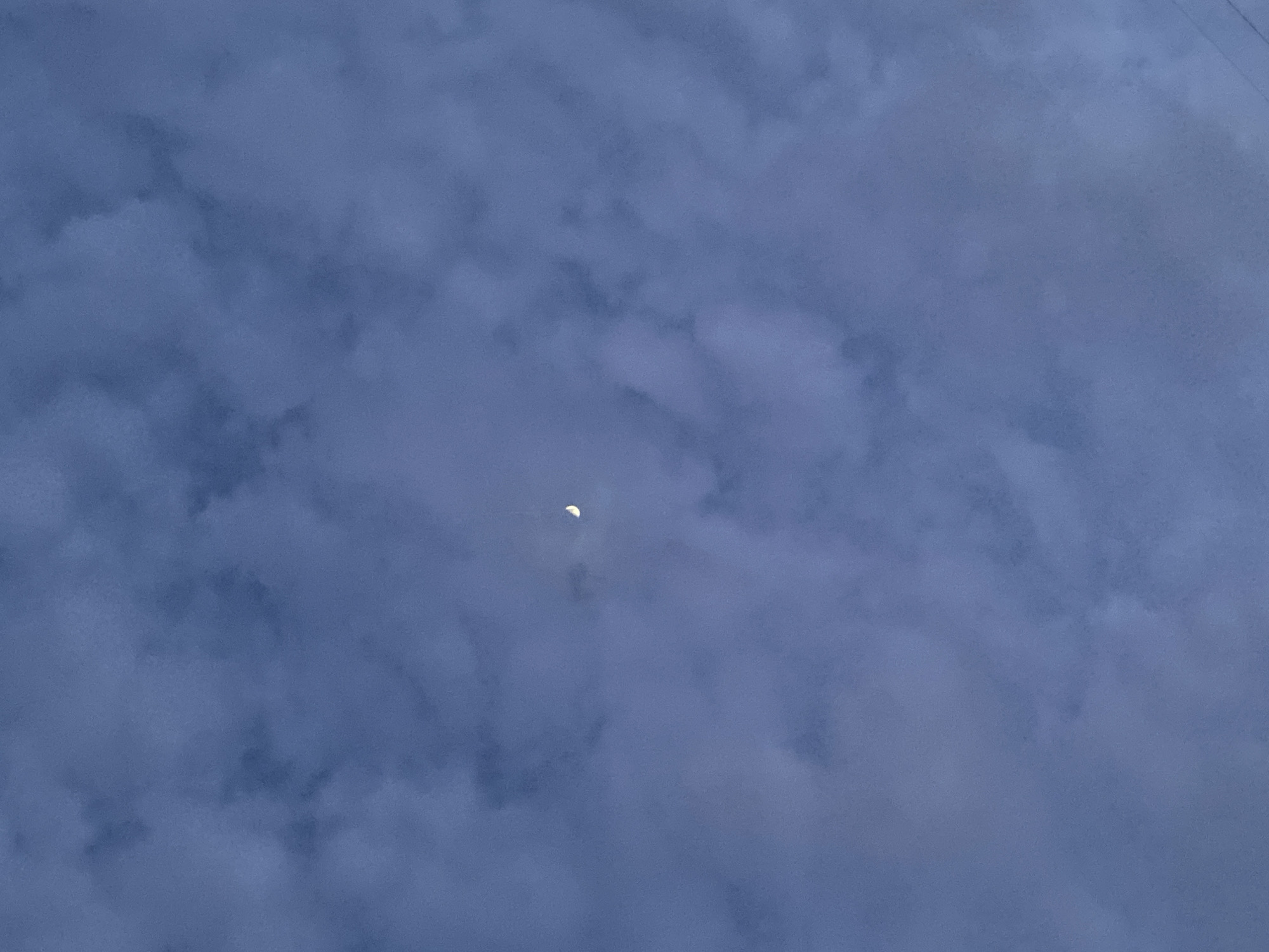 The location is unknown within the city of Unknown, Unknown. The scene depicts an outdoor environment dominated by a sky filled with scattered, light-colored clouds against a dark blue-grey background, indicative of dawn or dusk. A thin, illuminated crescent moon is visible in the upper central portion of the frame, positioned towards the left of the image's vertical midline. No individuals, ground-level objects, specific actions, or interactions are discernible.