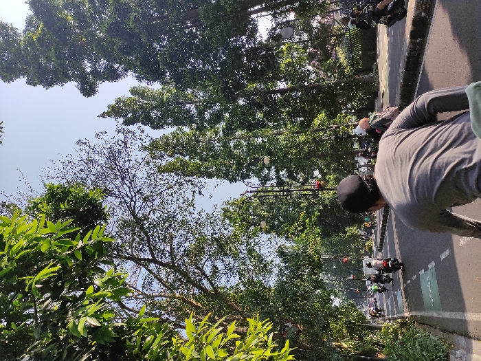 The image displays a daytime urban street scene viewed from a low-angle perspective, positioned behind an individual. The scene does not correspond to the characteristics of Nieste, Germany, but rather an urban environment with high scooter traffic density often associated with Southeast Asian cities. In the foreground, the back of a person wearing a grey long-sleeved shirt and a black cap is visible, with the lower torso partially obscured. The person is oriented forward, slightly turned to the right. The midground features a paved multi-lane road. The left side of the road includes a green-painted bicycle lane marked with a white bicycle symbol. Numerous motorized scooters and motorcycles occupy the road; several are seen moving away from the viewer in the left lane, and another is visible in the right midground. A white van is discernible further down the left lane. Tall, verdant trees line both sides of the street, creating a canopy effect overhead. Ornate street light poles with decorative elements are intermittently spaced along the roadway. To the right, a raised curb and a strip of vegetation separate the road from a sidewalk, beyond which a dark fence or wall is visible. The sky is clear and blue, indicating a sunny day, with strong shadows cast on the asphalt.