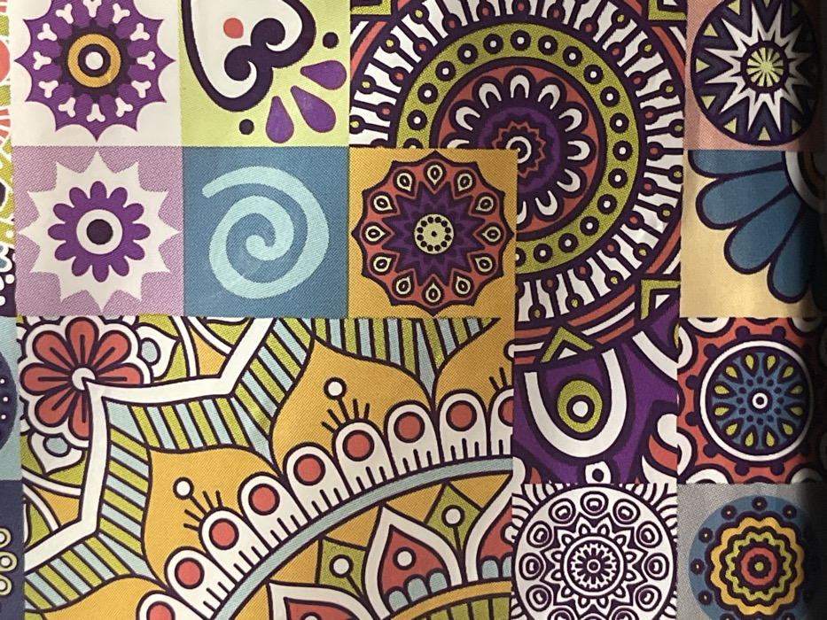 The image displays a patchwork of colorful, geometric, and floral patterns arranged in a grid-like fashion. The motifs include mandala-like designs, stylized flowers, spirals, and paisley elements in a variety of colors like purple, blue, green, orange, and yellow. Each pattern is contained within a square or rectangular block, creating a mosaic effect. The overall aesthetic is vibrant and bohemian.