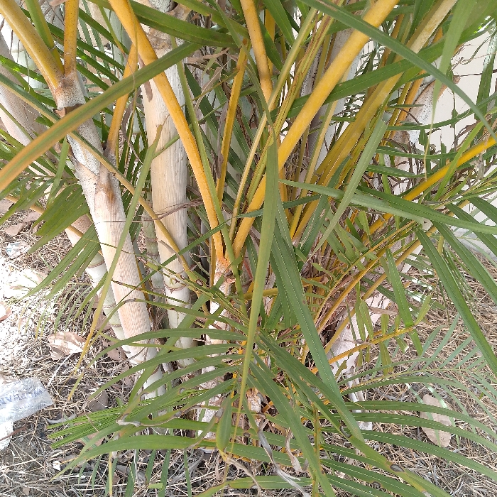 The image displays a close-up, eye-level view of a dense clump of a perennial plant, located in Rayfield, Nigeria. The central focus is on numerous upright stems and foliage. Multiple plant stems are visible, varying in color and thickness. Several prominent stems are pale cream to off-white, exhibiting distinct segmented nodes characteristic of bamboo or certain palm species. Interspersed among these are numerous thinner stems that are bright yellow. The plant features an abundance of long, narrow, lanceolate leaves, predominantly green, some displaying areas of yellow discoloration or browning. These leaves are densely clustered around and between the stems. The ground beneath the plant is visible in the lower portion of the frame. It consists of dry, light-brown soil mixed with sparse, desiccated plant matter and fallen dry leaves. In the lower-left corner, a crumpled white plastic bag or piece of plastic refuse is partially visible on the ground. No human figures, animals, specific actions, or interactions are depicted in the scene. The lighting indicates an outdoor environment under natural daylight.