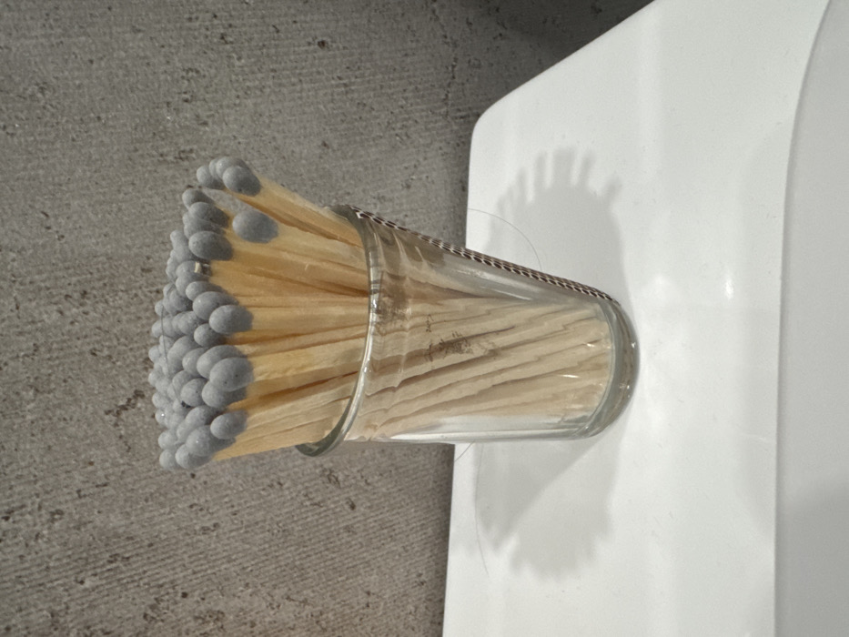 A clear glass tumbler, approximately half-filled with numerous long-stemmed wooden matches, is centered in the frame