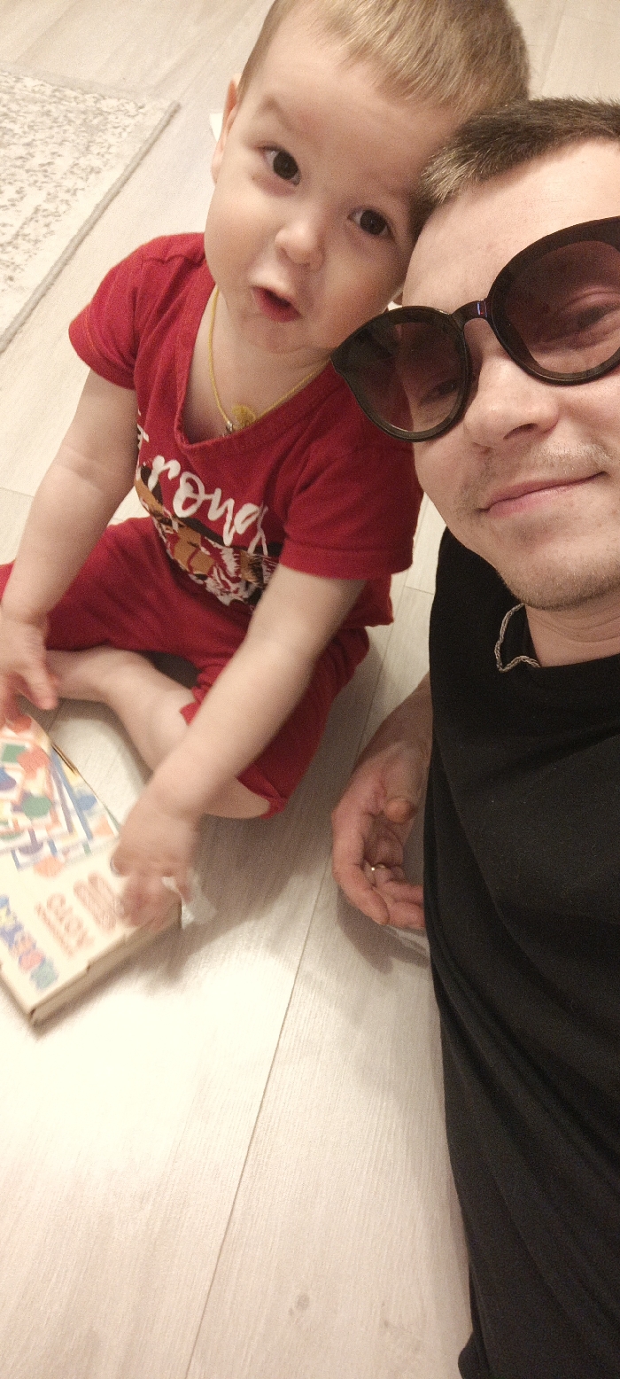 The image captures an adult and a young child on a light-colored wooden plank floor indoors in the city of Марковский, Russia. The adult, visible on the right, is a male with short dark hair and facial stubble, wearing a black t-shirt, dark-rimmed sunglasses, and a silver-colored chain necklace. A gold-colored ring is present on his left ring finger. He is positioned at floor level, looking towards the camera with a slight smile. To his left, a young child with light hair, dressed in a red short-sleeved t-shirt with a graphic and red pants, and wearing a yellow necklace, sits cross-legged. The child's left hand is positioned near a rectangular object with colorful patterns, possibly a book or box, on the floor. A portion of a light-colored patterned rug is visible in the upper left background.
