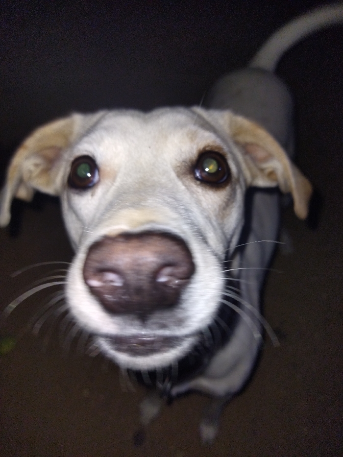The scene is located in Tinaquillo, Venezuela. The primary subject is a light-furred dog, possibly cream or pale tan, depicted in a close-up, high-angle shot looking directly at the camera. Its face dominates the upper-central portion of the frame. The dog's dark, moist nose, displaying two visible nostrils, is in sharp focus at the bottom center. Whiskers extend outwards from either side of its muzzle. Its dark brown eyes show prominent circular greenish reflections, indicating flash photography. The dog's ears are floppy and light-colored, matching its fur. A segment of a dark collar or harness is visible around its neck. The background and the ground beneath the dog are uniformly dark, suggesting low-light conditions, possibly nighttime or a dimly lit indoor environment with an unidentifiable dark surface. No other individuals or distinguishing objects are discernible.