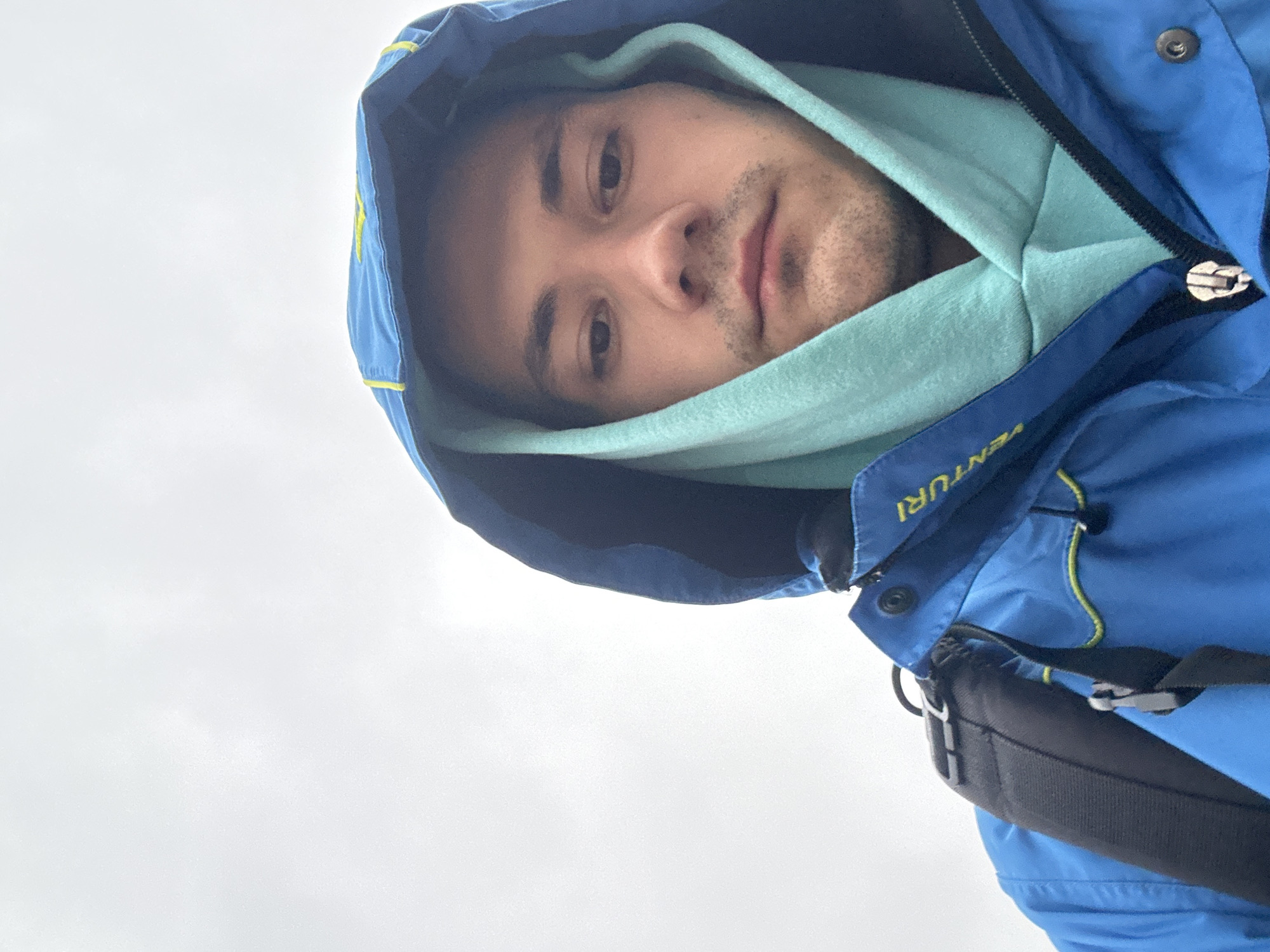 A man is pictured in a selfie style image, wearing a blue hooded jacket and a light blue inner layer, possibly a hoodie