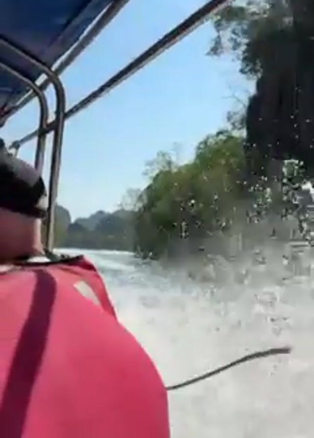 boat moving quickly through water, creating a large wake. A person wearing a red life vest is visible in the foreground. The background shows lush green vegetation along the shoreline and karst formations. The sky is blue and clear. The camera is on the boat and moves with it.
