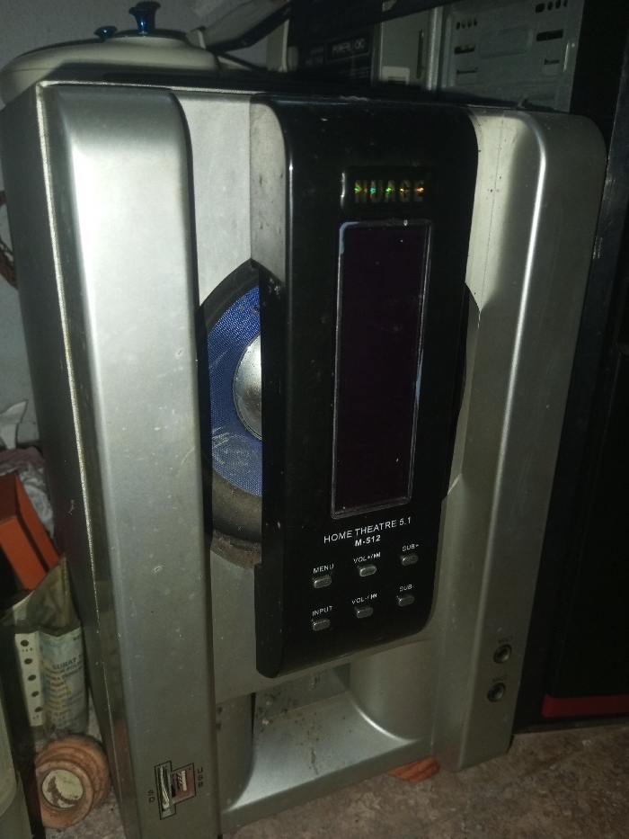 The image features a dusty "NUAGE" home theater 5.1 speaker system, model M-512. The device has a central black panel with a screen and buttons for menu, input, volume control (VOL +/-), and subwoofer adjustment (SUB +/-). A speaker is visible on the left. Connectivity options include USB and SD card slots located at the bottom left corner. The device appears aged and in need of cleaning.