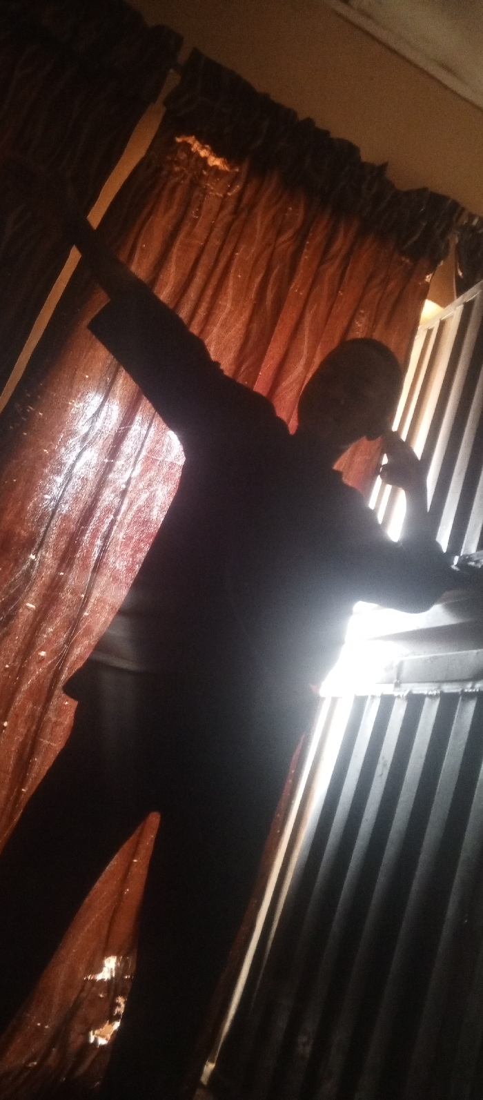 The image depicts an indoor scene in Tunga Mekidi, Nigeria. A human figure, silhouetted by strong backlighting, is positioned centrally within the frame. The individual, of indeterminate gender, stands with their left arm extended upwards and outwards to the left. Their right arm is bent at the elbow, with the right hand positioned near the right side of their head, obscuring the facial area. The figure appears to be wearing a long-sleeved top and trousers, though details are lost due to the silhouette. To the left of the figure, a dark orange or brown curtain with vertical pleats hangs. To the right, a bright light source is visible behind a structure composed of vertical, corrugated panels, consistent with a window fitted with blinds or shutters. This intense backlighting creates a stark silhouette of the person, rendering specific facial features, clothing textures, and colors indistinguishable. The ambient lighting of the room is dim, with the primary illumination originating from the window on the right.