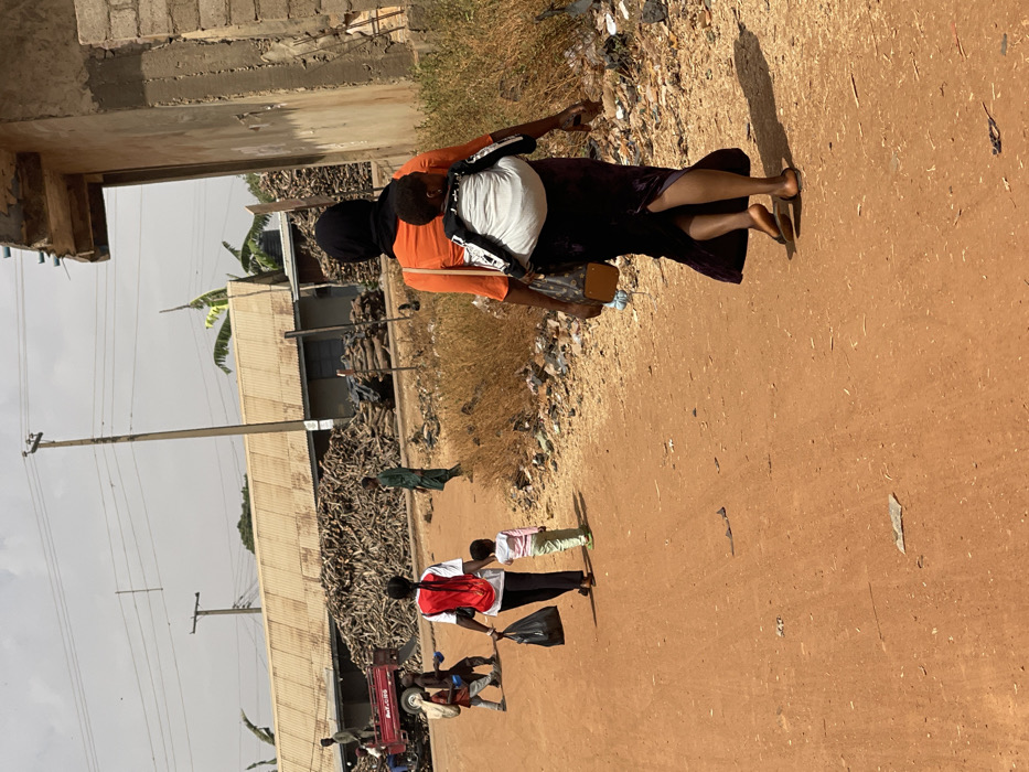 The scene depicts a sunny, outdoor environment in Muchiya, Nigeria, on an unpaved, reddish-brown dirt road