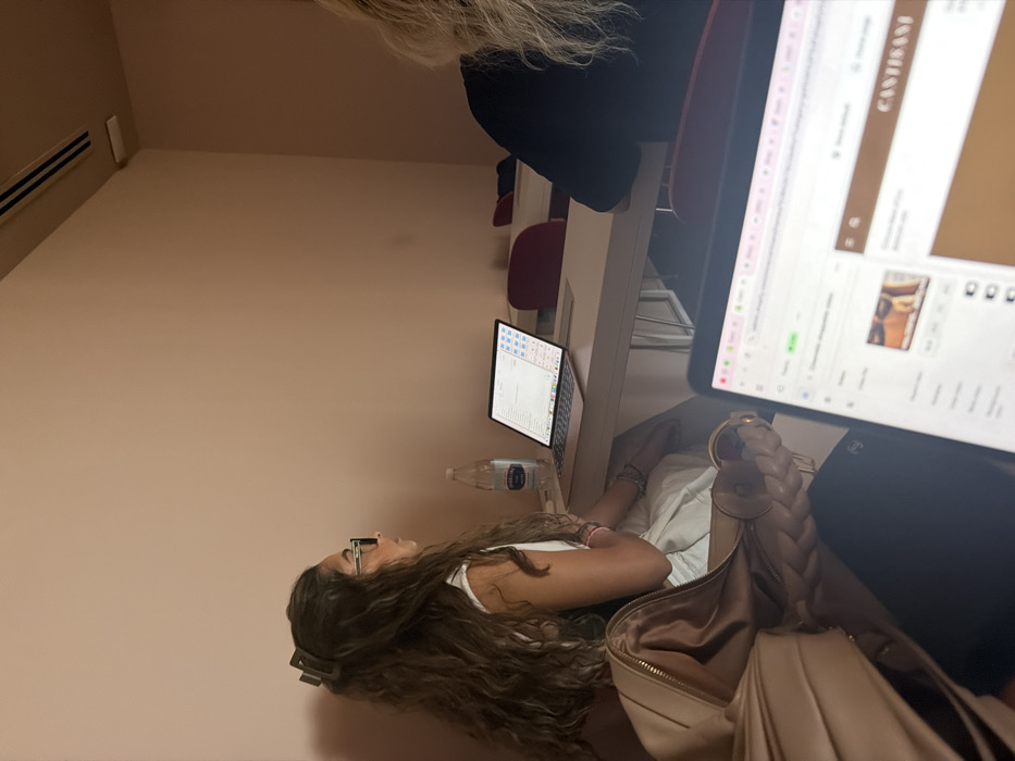 The scene depicts an interior room, identified as being in the city of Miami, United States of America. The room features uniformly light peach-colored walls and a ceiling with a linear air conditioning vent visible in the upper right. Multiple individuals are seated at light-colored rectangular desks with metal supports. In the mid-left of the frame, a female individual is seated in profile, facing to the right. She has long, wavy brown hair, secured at the back with a dark rectangular hair clip. She wears dark-framed eyeglasses and a white sleeveless top. A light-colored, possibly beige, shoulder bag with a braided strap is positioned in the lower left foreground, partially obscuring the lower half of her body. On the desk directly in front of this individual is a silver-colored laptop, open and powered on, displaying an operating system interface with application icons and a document window. A clear plastic bottle of Sorgesiane brand water rests to the left of the laptop. To the right of the central figure, a second individual is partially visible from behind, exhibiting light blonde or very light brown curly hair and wearing a dark-colored garment, seated at an adjacent desk. In the immediate foreground, a third laptop is open, displaying multiple web browser tabs. One visible tab shows a video thumbnail, and another section displays text including "CANTISANI." Beyond the desks of the visible individuals, additional dark red chairs are positioned at other desks, indicating further seating arrangements in the room. The individuals are positioned as if attending a class, meeting, or engaged in work, utilizing their laptops.