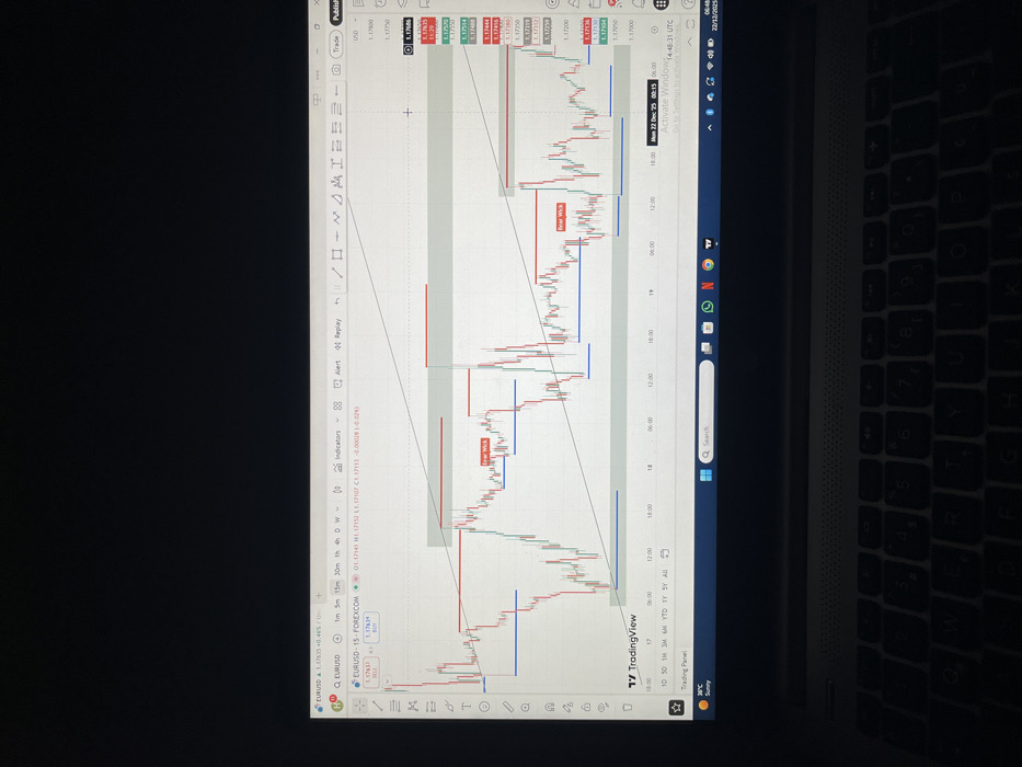 The image displays a laptop screen in Zango, Nigeria, exhibiting a financial trading chart from the TradingView platform. The chart focuses on the EURUSD currency pair, presented in a 15-minute candlestick view with green bullish and red bearish candles. Horizontal red and blue lines, along with gray shaded rectangular areas, delineate price levels and zones, while diagonal trend lines are also drawn. Specific labels such as 'Bear Wick' are present on the chart. The top left of the screen indicates 'EURUSD 1.17670 +0.46%' and displays 'SELL 1.17631' and 'BUY 1.17639'. The Windows taskbar at the bottom of the screen shows a weather icon indicating '30°C Sunny' on the left, and the date '22/12/2025' and time '06:48' on the right. The upper portion of a dark-colored laptop keyboard is visible beneath the screen, slightly out of focus. The surrounding environment appears dark, suggesting low ambient light.