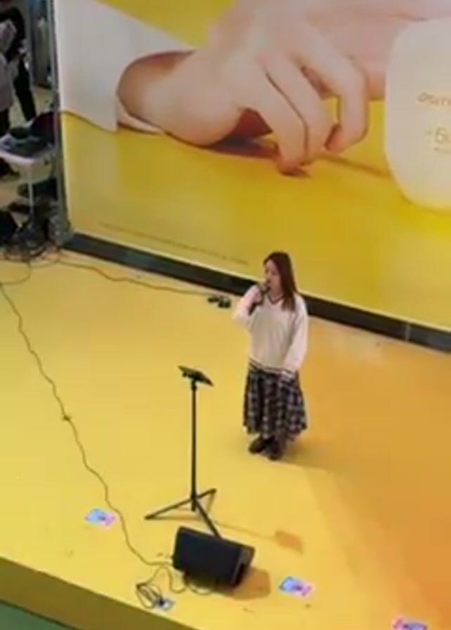 A woman is singing into a microphone on a small, yellow stage. She is wearing a light-colored sweater and a plaid skirt. Behind her is a very large advertisement for a skincare product, featuring a male model. There are a few people standing around watching, and some audio equipment is visible on the stage.